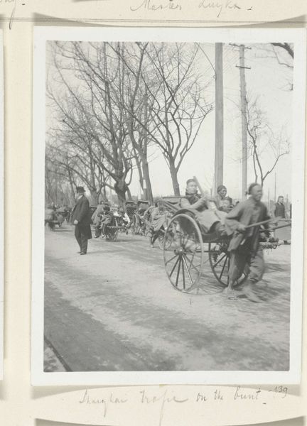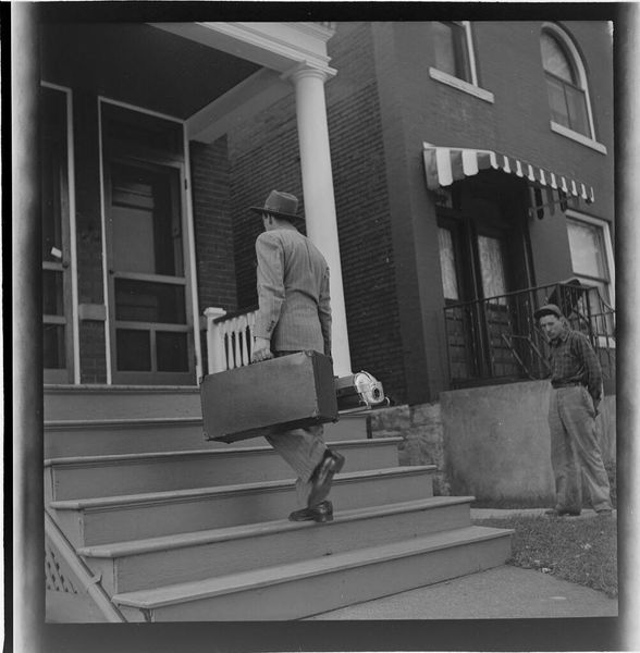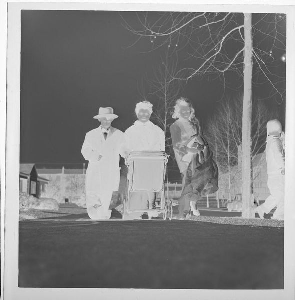 Editor: This photograph, titled "Untitled (children playing dress-up and walking baby carriage on sidewalk)" by Jack Gould, captures a moment of childhood imagination. I'm struck by the stark contrast and how it almost feels like a scene from a play. What do you see in this piece? Curator: For me, it's all about the power of play and how children construct their own realities. The formality of the dress-up clothes, juxtaposed with the everyday sidewalk, creates a beautiful tension. It makes you wonder what stories they're telling themselves, doesn't it? What do you think? Editor: It does! It's like they've built a whole world. It's interesting how such a small image can evoke something so big. Curator: Exactly! It's a little portal. Gould has captured a universal human experience. I love that.