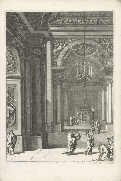 Curator: What a grand vista! We're looking at "Galerij van een paleis met een kroonluchter," or "Gallery of a palace with a chandelier," an engraving by Jean Lepautre from 1659, currently held at the Rijksmuseum. Editor: It's stunning how he captures that echoing vastness with just lines! Makes you feel utterly small, like you’re about to get swept away by a polite, but powerful, Baroque wind. Curator: Lepautre, working firmly within the Baroque style, certainly intended to evoke that sense of awe. Consider the symbolism present here: the vanishing point perspective drawing your eye deep into space, combined with the magnificent chandelier that suggests enlightenment and grandeur. Editor: Right, there's that light! But there's also the sense that everything's staged, like we're peering into a theatrical set. Even the little gathering of figures seems performative. Curator: Exactly! Baroque art often acted as propaganda. Here, the palace represents absolute power. The very architecture is designed to impress upon visitors the might and glory of the patron. Notice how even the distant figures almost seem to fade into insignificance? Editor: Good point! The figures actually make the space, they give context of that overwhelming size. They feel a bit lost actually. Is this a reflection of the ruling elite's perception of common people? Like extras in their drama? Curator: Possibly! In this period, palaces were not just residences; they were stages upon which power was visibly enacted. The architecture and art served as constant reminders of social hierarchy and royal authority. This imagery certainly highlights the Baroque focus on grandeur and the controlled display of authority. Editor: The overall sensation makes me uneasy, strangely. While it celebrates beauty and scale, there’s also the subtle impression of alienation and rigid control... I find it overwhelming. What about you? Curator: I can appreciate that. While dazzling on a surface level, that psychological tension between individual and state power resonates even today. Editor: A pertinent piece indeed; something to be cognisant of.