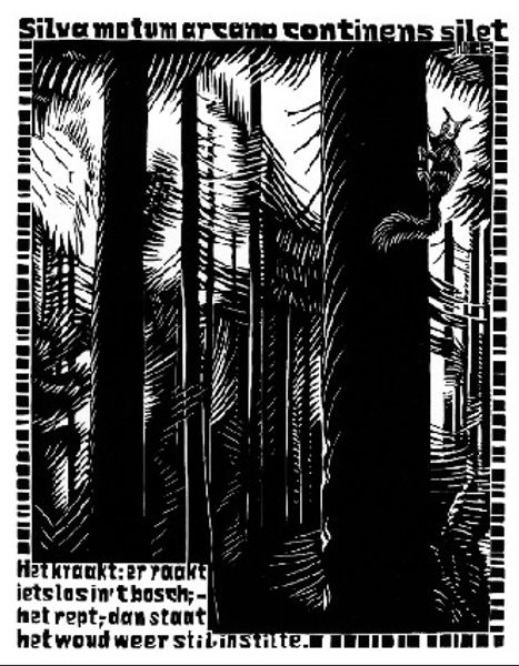 Curator: Here we have M.C. Escher's "Flor de Pascua - Fulfillment," created in 1921. It’s a woodcut, showcasing his early explorations with stark contrasts and figuration, predating his better-known tessellations. Editor: It gives me this claustrophobic sensation. Like being surrounded by reeds, but instead of tranquility, there's something a bit menacing about those dense black lines pressing in on the figure. What do you make of that? Curator: It's a potent atmosphere, certainly. The dynamic play between positive and negative space forces our eye to discern form from abstraction. The geometric treatment of natural forms like those flower-like or flame-like patterns surrounding the central character lends a powerful sense of psychological weight, almost bordering on Expressionism. Editor: Right, because the central figure almost vanishes into the reeds. It's almost as if nature's both protective and consuming. The lack of gray tones—just pure black and white—adds to this heightened drama. Tell me more about that hidden figure, though? Curator: In exploring Escher’s history at the time, it is important to mention the possible influences of Art Nouveau on his style. Escher would explore various realms during the period; the angular, sharply delineated form echoes archetypal images. What seems at first to be a portrait of this androgynous character with stylized features becomes completely entwined with the geometric patterns around them, suggesting themes of emergence and confinement, blending organic forms and more geometric structures. Editor: Which loops us back to that feeling of being utterly enveloped. Even though it’s static, there is movement—or impending movement, in the piece. You know, I was just reading something about ink line art from that period, Junji Ito style, in particular, with the dark outlines. Is that on point with Escher’s art? Curator: Very possibly. And in examining the recurring motif of linear designs in woodcuts, which certainly appears to resonate here in Fulfillment, one might find a commentary on mortality as well. Editor: Wow. So what starts as a seemingly straightforward image reveals layer upon layer of meaning. It's almost dizzying! Curator: Indeed. "Fulfillment," in its seeming simplicity, opens doors to pondering on the balance between expression and constriction and reminds us of our intertwined relationship with the spaces that hold us. Editor: You’ve given me a totally different perspective on this work, and you've highlighted Escher’s ability to weave complex symbolic threads within relatively simple visual forms. It is incredible to see how art, at any given moment, can create lasting historical meaning.