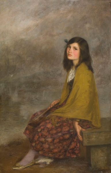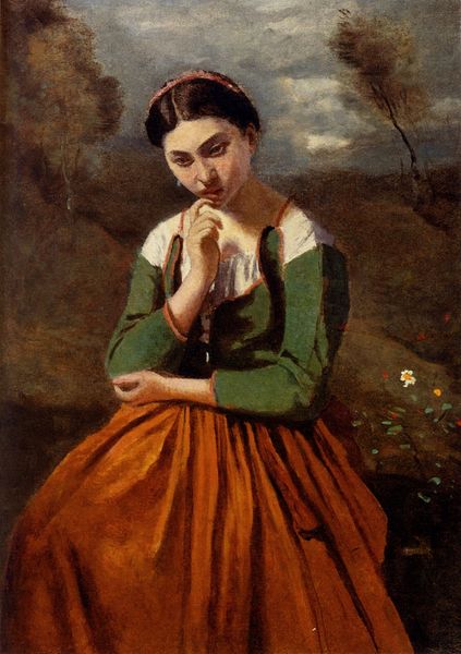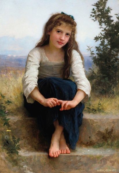 Curator: Bouguereau's "Mignon," completed in 1869, presents us with a portrait nestled within a landscape, rendered in his characteristic oil paint technique. Editor: It strikes me immediately as possessing a deep melancholy, the figure seemingly isolated within this rugged backdrop. The tight composition focuses all our attention on the girl’s plaintive expression and how her posture creates a pyramid, rooted on her dark clothing. Curator: The posture you describe acts as more than compositional framework, I believe. Hands clasped in her lap, she appears restrained. Consider the title, "Mignon" – suggesting smallness, daintiness and fragility. It invites interpretations linked to Romanticism's fascination with youth, innocence and vulnerability, themes heightened by the enveloping landscape. Editor: Indeed, she could almost be seen as a Romantic heroine lost within an epic painting. I keep returning to her eyes; they have a slightly downcast slant but do hold a determined gaze. Note that her dark hair and eyebrows, as well as her black clothes, contrast dramatically with her bright complexion and fair undershirt. Those opposing textures create balance but suggest duality: a combination of both resolve and sorrow in a world of beauty. Curator: I agree. The light plays skillfully over her skin, drawing the viewer into a very intimate interaction with her emotions. Let us consider the structure and lines in the rocks, for example. They point towards the subject as they are placed as supporting pillars to a unified figure. Editor: It does lead our gaze in a deliberate fashion to make this very point. Considering the time and culture, the imagery could carry many messages, including society’s perceived loss of innocence and virtue during industrial changes, a sentimental theme popular at the time. Curator: Ultimately, in my view, “Mignon” transcends its historical context. It offers viewers, across the ages, an access point for ruminations on universal themes and complex compositional forms. Editor: Absolutely. And seeing those themes reassert themselves in our minds really allows the power of the subject to transcend time itself.