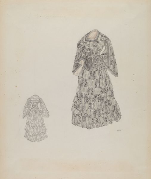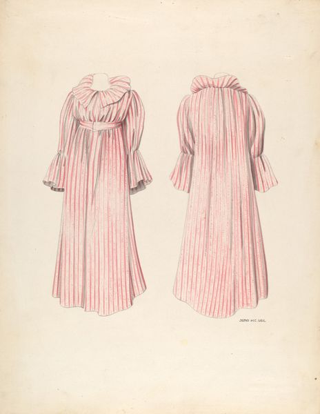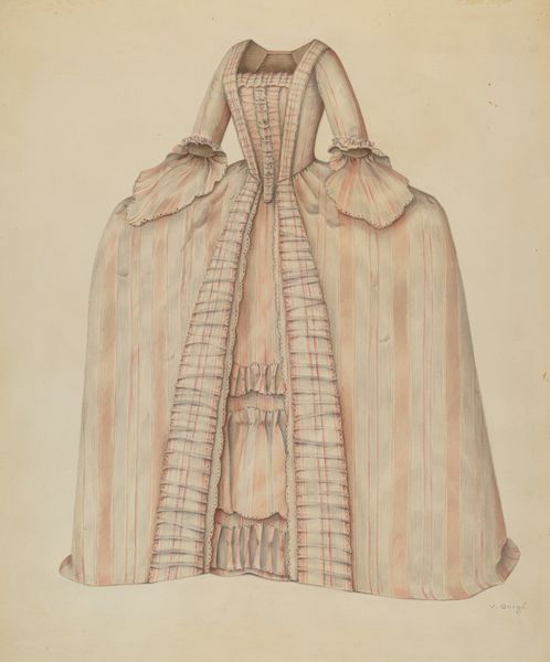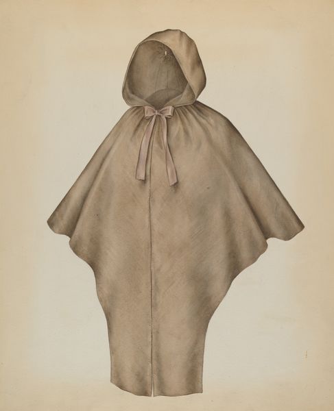 Francis Bruner created this watercolor rendering of a Shaker cape, but the date of its creation is unknown. The United Society of Believers in Christ’s Second Appearing, known as the Shakers, were a religious group committed to simplicity, utility, and communal living. This drawing offers insight into Shaker material culture and the ideals they promoted. The cape's design reflects the Shaker values of modesty and functionality, rejecting ornamentation in favor of clean lines and practicality. Made in the United States, this drawing also speaks to the Shakers' unique social structure and gender roles. Shaker communities were organized around equality between men and women; this cape was likely designed and produced within a female-led Shaker community. Scholars interested in the Shakers can consult historical documents, meeting minutes, and inventories of Shaker communities. These sources shed light on the social, economic, and spiritual lives of this unique group. The cape is a testament to the Shaker commitment to living a life of simplicity and devotion, and how this influenced their aesthetic choices.