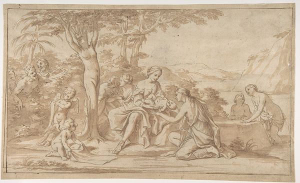 Curator: This is a fascinating watercolor drawing, "The Preaching of Saint John the Baptist," crafted by Gerrit Pietersz sometime between 1598 and 1604. It now resides here at The Met. Editor: What strikes me immediately is the almost dreamlike quality. The blues and browns... it's faded, or perhaps intentionally muted, lending a hazy feel. The gathering seems far removed from us in their focused listening. Curator: Yes, and notice how the use of watercolor gives it an airy, almost ephemeral quality. I wonder, what paper was available? What were the societal demands in artistic training or labor for a piece like this? Were these watercolor pigments derived locally? All things to think about for the conditions of creating an artwork such as this one. Editor: An interesting idea. What catches my eye, too, is the grouping of figures to the right. Is that a family, watching the sermon from afar, seemingly detached? A wealthy benefactor? Curator: I see what you mean, but isn’t it compelling how Pieterz utilizes landscape—that broad, slightly indistinct backdrop—not just as setting, but as an emotional stage? The northern renaissance focus is truly impressive when he is working within the means of readily available material culture for pigments and the skill of laborers making paper. Editor: You're right. It’s a skillfully crafted landscape that gives that open sky behind the crowd so much significance; all of it feels like a great precursor to more complex techniques yet to come. One also wonders how patronage for the materials might have further propelled his creativity and technique here? Curator: The use of available materials here emphasizes an economy of artistic labor in such Northern Renaissance-esque biblical paintings. So much is emphasized simply from looking at how this artist has to pull from accessible local material sources. I always learn so much every time I pass by. Editor: I feel so close to this moment and time, like this artwork offers so many little mysteries to engage with and reflect. Thanks so much for pulling this back to the materiality to the era!