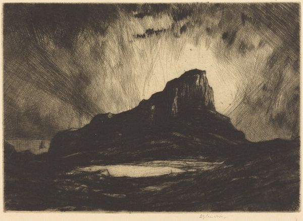Curator: Right, let's consider Albert W. Barker’s 1932 print, "The Stronghold." He crafted it using pencil and charcoal—a fascinating mix. Editor: Immediately, I feel this somber weight. That heavy darkness, the isolated building… it's almost gothic, even though it's just a print. The looming texture must have demanded real physicality from the drawing process. Curator: The texture's key; you're right. Notice how the charcoal almost melts into the paper to create this deep atmospheric perspective. It's modern in its stark simplicity, yet the subject suggests something much older. Editor: Exactly! What materials, and what kind of labor went into constructing this tiny structure that, judging by the shadows and the hill it sits on, may in reality be an enormous edifice or part of a defensive bulwark in a contested landscape? Is this strength, is it home, or a fortified enclosure built at the expense of something or someone? Curator: Perhaps all those things at once. Think about the title itself, "The Stronghold". A physical place, definitely, but maybe it’s also hinting at inner strength, or resilience in the face of something overwhelming, much like the economic backdrop of 1932… a nation struggling. Barker really evokes this feeling with those simple monochrome tones. Editor: Or maybe it represents something about labor practices in the printing industry in the 1930s? Looking closely, there are marks and impressions that might be interpreted to index certain machine tooling used in this print edition. We need to learn about the workshop to really understand this! Curator: Always focused on the material reality. Fair enough. For me though, its enduring appeal lies in that tension between stark realism, conjured through basic materials, and the very subjective, dreamlike quality the composition inspires. Editor: An unresolved, perhaps even unresolvable duality; which ultimately leaves a powerful trace of art as labor—and that to me is its most lasting quality.