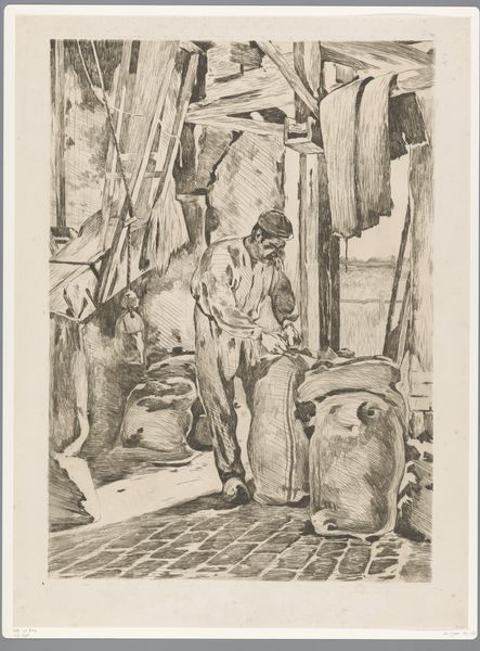Max Slevogt made this etching, *Ein lesender und ein stehender männlicher Akt*, around 1922. It’s an image of two men in the sun, one reading. I love how Slevogt uses these scratchy, energetic lines to create a scene that feels both intimate and a little chaotic. It's like he's capturing a fleeting moment, a casual snapshot of everyday life. Look at the way he renders the foliage in the background, it’s a flurry of dark, almost frantic marks. Then compare that to the figure on the left, in the hat, reading a book. Slevogt uses a more delicate touch, softer lines to define the form. The contrast is really striking. This work reminds me a bit of early Manet, in the sense that the forms are created through line. Like Manet, Slevogt seems more interested in capturing the essence of a moment, the play of light and shadow, than in achieving a perfect representation. It's this kind of honesty that keeps me coming back to art.