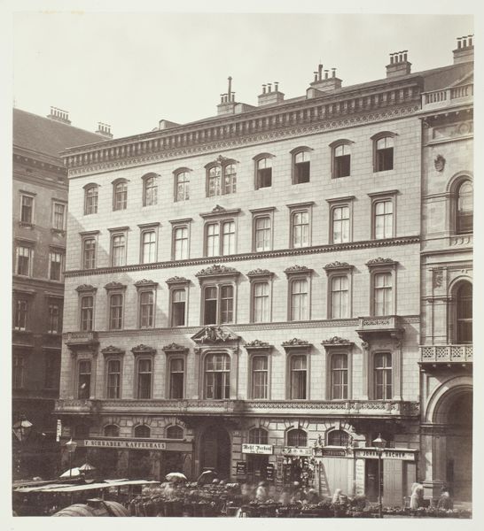 Curator: This photograph captures Kärnthner-Ring No. 4, the residence of J. Ritter von Königswarter, circa 1860s. Editor: My immediate impression is of a kind of austere elegance. The rhythmic repetition of the windows creates a compelling pattern, but there’s also a somber mood about the closed shutters on the ground floor. Curator: The closed shutters certainly speak to the period, hinting at societal norms regarding privacy and public presentation. This photograph isn't just about architecture; it's about status and social standing in 19th-century Vienna. Königswarter was a prominent figure; his residence would have been a significant symbol. Editor: I agree, the formal arrangement is important. Note how the building is framed by the flanking structures. This accentuates its volume. And yet, despite its formality, there is something lifeless about the symmetry—almost as if the house is merely an effigy of one. Curator: Interesting you say that, considering the burgeoning field of photography at the time. Photography aimed to capture reality, of course, but it was always presenting a carefully curated version of it. The photographer here may have been less interested in life than documenting urban development. Editor: Perhaps, but that intent doesn't negate the formal qualities. The subdued tones contribute to a kind of melancholic stillness. I am also thinking about the line, its exactitude is part of that formal composition. The slight distortion reminds one of the physical constraints of the photographic technology, the material of the era. Curator: I agree that the distortion is palpable and that we cannot discount its effect on one's impressions. We must remember, however, the technology allowed for new modes of documentation and created accessibility where none existed before. As a public image, it contributed to both memorializing a structure and popularizing new conceptions of urban space. Editor: Point well-taken. Ultimately, the photograph compels me to contemplate how its formal presentation contributes to constructing societal narratives in its historical milieu. Curator: For me, this image exemplifies how even seemingly straightforward architectural photography carries profound cultural and historical information within its frame.