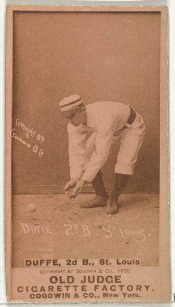 This small photograph of George Quintus Shoch, a right fielder for the Washington Nationals, was made as a promotional item for Old Judge Cigarettes. It's a mass-produced object, meant to be collected and traded, and it reflects the commercialization of baseball in the late 19th century. The photograph is printed on thin paper, and its sepia tone gives it a nostalgic feel. This card wasn't originally intended to be an artwork; it was a marketing tool. But it still has a certain aesthetic appeal, in the way that it captures a moment in time. It also reveals a lot about the changing nature of labor. Shoch is depicted not in the heat of athletic action, but rather in a moment of quiet preparation. Ultimately, the Old Judge series demonstrates how even everyday objects can become valuable artifacts, telling us about the culture and economy of their time. It challenges us to consider the value of materials, and the process of making in understanding the full meaning of an artwork.
