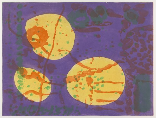 Curator: Helen Frankenthaler's "Plaza Real" from 1988 employs acrylic paint in a manner that defines modern colour-field painting. What's your initial reading of its visual qualities? Editor: Immediately, the high-keyed, warm palette strikes me—the bright cadmium yellow screams 1980s. And that intense ultramarine band anchoring the composition at the bottom—it’s strangely calming against all that solar energy. Curator: The formal tension between that ground, you correctly observe its stabilising nature, and those ethereal, floating forms in the picture plane activates a spatial dialogue. See how the semi-transparent washes build layers, creating depth despite its commitment to flatness. Editor: Right, because the Colour Field painters wanted to dissolve the figure-ground relationship. Yet this almost totemic configuration imposes an interesting, unintended symbolism. In what ways do these shapes engage with abstraction as it developed within modernism, specifically? Curator: The washes allowed Frankenthaler to investigate surface and stain as both form and field, expanding the possibilities that Greenberg proposed. One must recognize the formal aspects through an attention to line, color, and planar relations. Editor: But formalism itself, Clement Greenberg included, evolved through, and alongside specific institutions and cultural imperatives, didn't it? Frankenthaler exhibiting at places like the Jewish Museum certainly influenced how this was read at the time. Do we ever extract artistic output fully from such societal contexts? Curator: Undoubtedly, reception shifts with the zeitgeist. But consider how line asserts itself irrespective of a potential social context— that simple, vertical mark in the upper register echoes down to a thin application of crimson: notice how this line generates an axis. Editor: Agreed. That vertical accent does lend the composition an unusual gravitational center. In conclusion, viewing Plaza Real is quite illuminating as a journey through art's forms. Curator: An articulation which provides great access in a broader social setting.