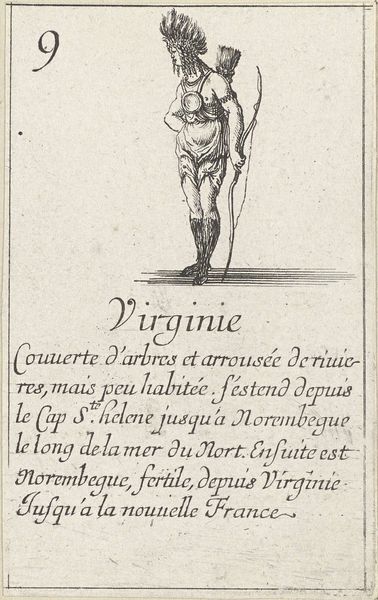 Editor: Here we have "Vrouw uit Yucatán," or "Woman from Yucatán," an engraving by Stefano della Bella dating from 1620 to 1664. It’s a striking image—the figure is so carefully delineated. I am intrigued by how the artist represents this Indigenous woman. What's your take on this print, considering its historical context? Curator: This print speaks volumes about the European gaze on the Americas in the 17th century. Note the inclusion of the French text beneath the figure, defining Yucatán. It points to a colonial project of not only claiming land but also naming, classifying, and ultimately, understanding through a European lens. Editor: So, it’s not necessarily an accurate portrayal? Curator: Accuracy isn't really the point here. These images served a purpose—they fed European curiosity and justified colonial ambitions. Think about the power dynamic at play. Who gets to represent whom? How does that representation impact the perception and treatment of Indigenous populations? Look at the items this woman holds, a weapon and what looks like a peace pipe, a juxtaposition typical for those kind of images to show potential of conquest. Editor: It’s fascinating to consider how even seemingly objective images like this are embedded in a specific cultural and political context. Curator: Exactly! And how those contexts shaped—and continue to shape—our understanding of history. Do you see this engraving differently now? Editor: Absolutely. I'll definitely look at similar images with a more critical eye now. Thank you.