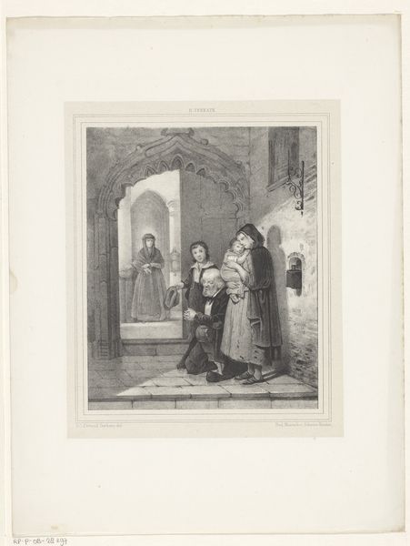 Curator: Here we have "Jongen en politieman op een straat," which translates to "Boy and Policeman on a Street," a pen and ink drawing created sometime between 1887 and 1916 by Willem Pothast. Editor: The mood strikes me as oddly theatrical, almost dreamlike. The strong light source is so dramatic. Is the policeman interrogating this child? Curator: Possibly, or offering assistance. Genre scenes such as these offer small snapshots into urban life at the turn of the century, though that encounter remains ambiguous, and Pothast doesn't leave many clues in his style of realism. The drawing’s setting may point to that moment's culture. Editor: The way the light pools on the boy’s face emphasizes a sort of vulnerable honesty. I'm intrigued by what their relative positions signal about power dynamics at the time – that an ordinary kid could find themselves at the whim of someone tasked to surveil. Curator: Pothast, through his choice of this everyday interaction, invites viewers into that social contract. He depicts these scenes to address cultural norms of his time. We could perhaps interpret the light beam, coming from an officer's lamp, as a metaphorical light to represent authority and surveillance, where the system attempts to reveal and perhaps reform the child. Editor: Yes, this makes me think about systems of control, then and now, and how institutions impact our sense of safety or endangerment. I appreciate that the piece sparks thoughts about how such systems might particularly affect marginalized members of our society. Curator: And it's within such artistic mirrors that societal conversations really find substance. What do we accept and question through observation. Editor: Absolutely. The way it quietly challenges us to reconsider the status quo is a credit to Pothast's subtle art.