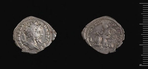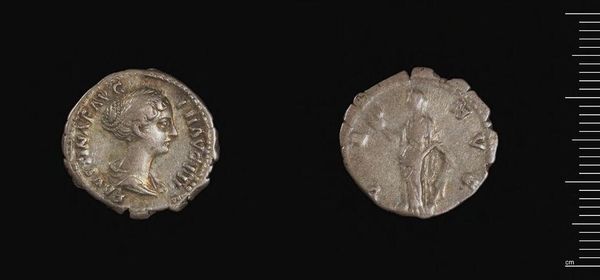 Curator: This is a denarius of Faustina I, a Roman coin that provides a glimpse into the economics and artistry of its era. Editor: There’s something haunting about this coin, particularly the portrait on one side – a profile of a woman, seemingly both powerful and serene. Curator: Indeed. The production of these coins, the extraction of the silver and its careful stamping, reveals a complex Roman economic system reliant on both natural resources and skilled labor. The slight imperfections hint at the human effort involved. Editor: The imagery itself is powerful too. On the reverse, a figure stands, perhaps a goddess. She clearly symbolizes something beyond simple commerce. It's about power, legitimacy, and the divine right to rule. Curator: Certainly, the symbolism played a vital role in conveying messages of imperial authority and prosperity. Considering its relatively small size, this coin served as an effective propaganda tool, a touchstone of power and trade circulating throughout the empire. Editor: It's fascinating how such a small object contains so much history, both economic and symbolic, almost like holding a piece of the Roman Empire itself. Curator: Absolutely. It reminds us of the tangible links between material culture and broader historical narratives.