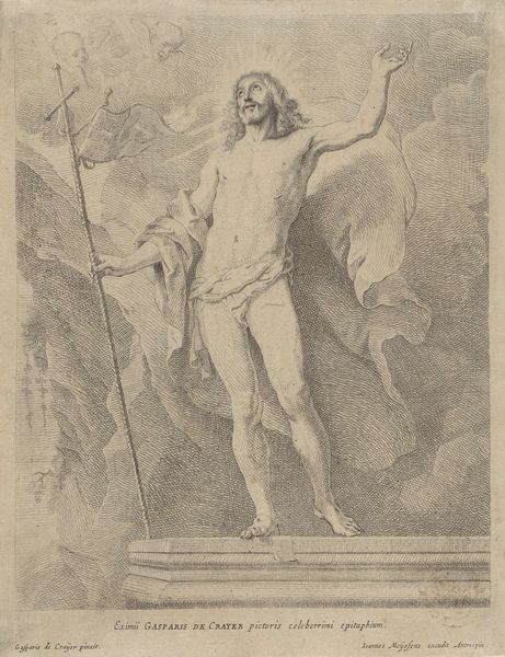 Curator: Here we have an engraving titled "Opstanding van Christus," or "Resurrection of Christ," dating from 1669 to 1678, presently held at the Rijksmuseum. It's a piece deeply embedded in the Baroque style. What's your immediate take? Editor: It's striking! There's this overwhelming sense of ethereal liberation. Christ seems to float off the page. There is this radiance of the engraver. I feel like he used light to give freedom. Curator: Absolutely. This work serves not just as a representation of resurrection, but also embodies the socio-religious currents of its time. The meticulous nature of the engraving process itself, the labor involved in producing these prints. Prints allowed to diffuse images widely and quickly through Europe in the XVI and XVII centuries. Editor: It makes me wonder about the engraver's state of mind. The delicate balance of light and shadow must have taken intense concentration. What’s remarkable is that you get some of the dramatic force that you would expect to see in oil paint. He uses such small, fine lines. Curator: Precisely, and consider the material value. The paper, the ink, the tools. The final purpose would be religious practice. And from the viewer, there's labor, a contribution, when the image is engaged to express spiritual connection. It bridges class divides. Editor: I like how it seems suspended between the earthly and the divine. A ghostly echo of the human, breaking free. You get a real feeling of release and ascendance. Almost as if that engraver thought freedom might lie in devotion. Curator: So we've moved from initial aesthetic appreciation, thinking about material practices and broader networks that shaped both its creation and its reception. Editor: Indeed. What started as a sensory experience, has given to this material and a broader spiritual reality, grounded in history, yet always reaching towards transcendence.