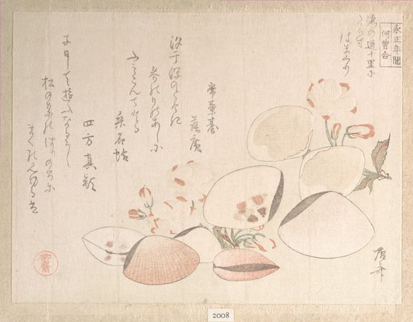 Curator: Look at this gorgeous print: Totoya Hokkei's "Vergeten schelp, pruimenbloesem schelp en kersen schelp," created in 1821. Hokkei rendered it in ink and color on paper, employing the woodblock printing technique popular in the Ukiyo-e tradition. Editor: It's so quiet, so…minimalist. Just the gentle curve of the wave and these delicate shells scattered below. It feels ephemeral, like a fleeting moment captured. Curator: Hokkei’s piece operates within specific visual and poetic conventions. The Ukiyo-e movement, meaning "pictures of the floating world," reflected the lifestyle of the burgeoning merchant class. This work provides an important insight into Japanese society during the Edo period. Editor: Precisely. Shells in Japanese art are highly symbolic, often linked to transience, fragility, and the ebb and flow of life, of course. And beyond this, one wonders, how might these objects, literally found on the shores of Japan, serve to ground Hokkei and his intended audience within that cultural, social, and political matrix? The very act of arranging these specific shells suggests careful curation, maybe even narrative building. Curator: Definitely! The selection and composition are purposeful. Consider how the shells are laid out. They almost seem to form a pathway or suggest a narrative, leading your eye across the artwork. Editor: And consider the contrast between the tangible, earthly shells and the wispy inscription in Japanese calligraphy at the top. Is this perhaps a gesture to connect earthly existence with a spiritual realm or simply just the addition of poems related to shell-matching games "Kai-awase". This connection between materiality and ethereal beauty makes the piece truly remarkable. It triggers, somehow, a deep cultural memory. Curator: Absolutely. Hokkei prompts us to consider our relationship to nature, to history, and to each other. It demonstrates just how effectively he blended social critique with beautiful imagery. Editor: I think you're absolutely right, that merging makes the artwork relevant even now. Curator: And it gives you pause. There are so many layers beneath that serene facade.