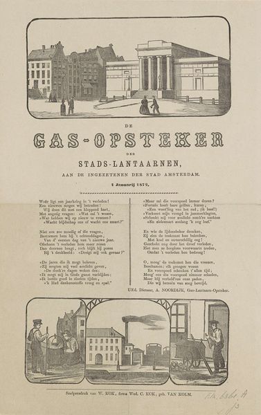 Editor: This print, entitled "Nieuwjaarswens van de gaslantaarnopstekers van Amsterdam voor het jaar 1854," roughly translates to "New Year's Greetings from the Amsterdam Lamplighters for the Year 1854." It dates back to around 1853-1854 and it seems to have originated from Amsterdam. The print, or engraving, feels almost like a historical snapshot, depicting city life, but it also carries this sentimentality of well wishes and public service. How do you interpret this work within its historical context? Curator: It's fascinating how this seemingly simple print encapsulates the societal dynamics of mid-19th-century Amsterdam. The lamplighters, crucial to public safety and the rhythm of urban life, are using this medium to communicate directly with the citizens. Think about it—what does it mean for the working class to participate in this form of public address? Editor: I guess it highlights a sense of community responsibility and perhaps even a bid for recognition or respect. They're not just anonymously performing their duties; they are actively wishing prosperity and safety to the city. Curator: Exactly. And let’s consider the form. A print meant for public consumption meant it was accessible. These workers aren't merely lighting lamps; they are attempting to engage in shaping civic identity and articulating a vision for the future. This is not top-down pronouncements but a collective of people doing the hard work. Where do we see echoes of this today? Editor: Hmm, I suppose we see similar expressions through things like public art, community initiatives, and even social media campaigns where ordinary citizens voice their hopes and concerns. It’s a bottom-up dialogue that can affect societal change. Curator: Precisely. The wishes for prosperity, safety, and unity during a time when the role of the 'gas-opsteker' would undergo drastic technological change, connects to today’s concerns and underscores the ongoing dialogue of how labor, class, and the very technologies we use shape the public sphere and collective identity. It provides valuable cultural understanding for how people are connected with each other. Editor: That’s a really interesting way to frame it! I never thought about this as being linked to public engagement. Thanks, that gave me a totally new perspective.