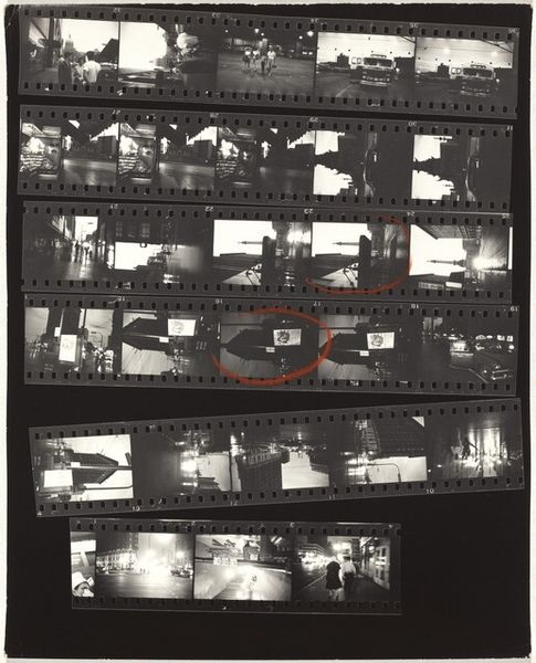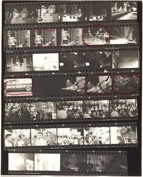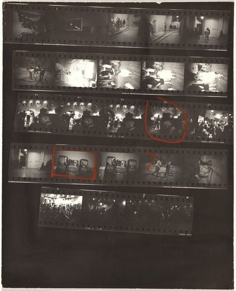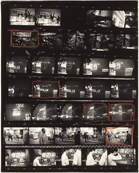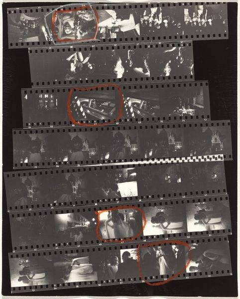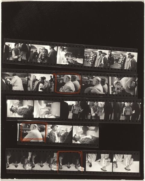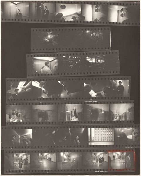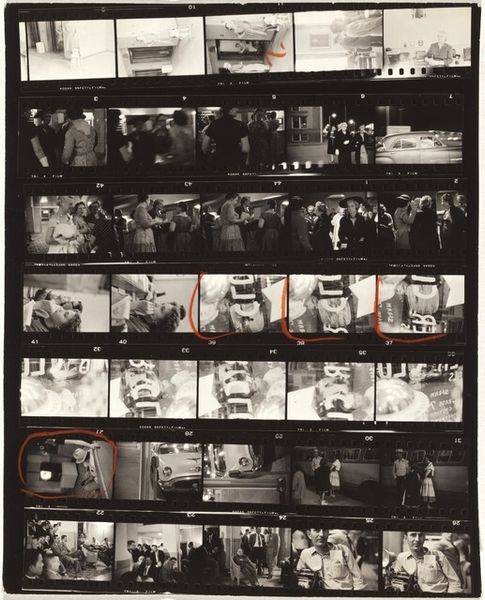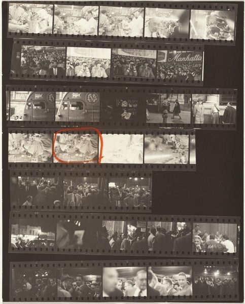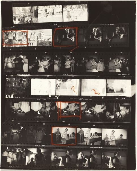 Curator: This is a contact sheet by Robert Frank, “23rd Street weddings—New York City,” taken around 1953-54, gelatin silver print. Editor: It’s interesting seeing all the shots together like this. The material is the contact sheet itself, I see the images of a wedding but what should I be paying attention to? Curator: Well, the contact sheet, as a material object, reveals a lot about Frank's process. He isn't just presenting the final polished image, but the raw, almost industrial, selection of photographs that reflect labor behind the ‘decisive moment’. Consider how mass production influenced not just the subject matter—weddings, a social ritual—but also the photographic process itself. Editor: So, the way he printed the photographs affects how we consider the image? I would've expected him to showcase only a perfectly printed photograph! Curator: Precisely! By showing us the contact sheet, Frank directs our gaze towards the means of production. How does this present a kind of democratization, if not demystification, of photography? Where does “craft” come into this kind of automated printing that seems more like it’s from a factory line? Editor: It definitely emphasizes the mechanical aspects of taking and producing photos, which can sometimes get glossed over. I can see how that makes a point about mass production. So it reflects labor and the production process that has an industrial quality... Thanks. I see weddings differently now. Curator: Think about how photographic technology enabled artists to capture and reflect the rapidly changing, often commercialized, face of mid-20th century life. This is also a raw and authentic approach and representation of wedding production. The whole contact sheet shows us a larger process, not just the singular iconic image.
