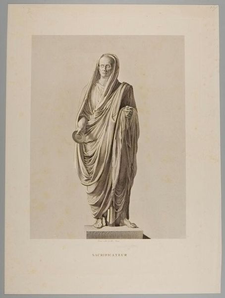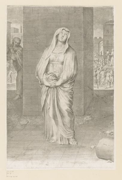 Curator: This is Albrecht Christoph Reindel’s "Messalina with the Infant Britannicus, after the Antique," part of the Harvard Art Museums collection. Editor: It feels so austere, almost cold, despite the implied tenderness of a mother holding a child. Curator: The image speaks to how classical sculpture was encountered and reproduced through printmaking practices. Editor: Absolutely. Think of the labor involved in creating this print, translating a three-dimensional form into precise lines. The materiality of the paper itself becomes crucial. Curator: The print also reflects the historical fascination with antiquity and how figures like Messalina were interpreted and disseminated for public consumption, shaping perceptions of Roman history. Editor: It’s amazing how the act of reproduction both preserves and transforms meaning over time. Curator: Precisely. These reproductive prints allowed the ancient world to be interpreted in new ways. Editor: It makes you consider the value we place on original artworks versus their reproduced counterparts.