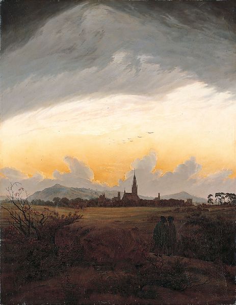 Art Historian: Caspar David Friedrich painted "Neubrandenburg" in 1817 using oil on canvas. It now resides in the Pomeranian State Museum in Greifswald. Curator: It's striking how small the human figures seem against that vast sky. A sense of overwhelming nature dominates here. Art Historian: Friedrich was a master of Romanticism. Look at the deliberate symbolism: the towering church spire piercing the heavens, contrasted with the small human figures. It speaks of aspiration, but also human insignificance against the divine. Curator: Insignificance, perhaps, but also the power structures inherent in religious institutions. Who are those two figures in the foreground? Are they dwarfed by the promise of salvation or liberation within that church? Art Historian: The figures often represent the artist himself or are stand-ins for the viewer. Notice their dark silhouettes, turned away from us, beckoning us to contemplate our own place within this spiritual landscape. It's a Rückenfigur, a common Romantic motif. Curator: And what about the historical context? This was painted after the Napoleonic Wars. Is this serene cityscape a celebration of restoration, or a melancholy acknowledgement of what was lost? Who benefited from this restoration? Was that promise equally afforded to all its inhabitants? Art Historian: The glow on the horizon certainly evokes hope. And light in Friedrich is often symbolic of spiritual illumination. Perhaps he’s suggesting renewal after a period of darkness. The golden sky—it’s transcendent! Curator: Transcendent for some, maybe. But art like this needs to be viewed with a critical eye. It's crucial to analyze the social conditions from which this idealized vision emerged and what narratives are excluded. Art Historian: I agree that context is vital, yet it does seem impossible to deny the enduring symbolic power of this particular cityscape, in the end. The way it reflects both human striving and a recognition of forces larger than ourselves. Curator: Indeed. This landscape offers a portal for reflection, so long as we dare to probe whose reflection we're truly seeing.