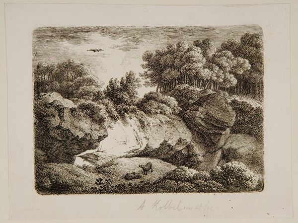 Curator: Looking at Anton Kölbl’s print, "Man Sleeping on the Ground," I am struck by how nature dwarfs the human figure. Editor: Yes, it's as if the landscape itself is exhaling a sigh. The sleeping man blends into the earth, a tiny, almost forgettable part of the scene. Curator: Köbl seems to be tapping into a tradition of the romantic wanderer, only here, the wanderer has simply stopped wandering. Editor: Perhaps exhausted by the weight of history, or perhaps just wanting a nap. I wonder, is this a critique, or a celebration of finding rest? Curator: It's both, isn’t it? A quiet rebellion against the relentless march of progress, finding solace in the enduring presence of nature. It's nice to know that art can still give us a moment to breathe. Editor: Indeed, a reminder that sometimes, the most radical act is simply to rest.