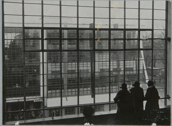 Curator: Mauro Restiffe's black and white photograph, "Empossamento #4," captures a striking architectural scene. What's your immediate impression? Editor: Stark and geometrically powerful. The contrast between the smooth, bright surfaces and the dark water is compelling, and the tiny figures give a sense of scale. Curator: Restiffe, born in 1970, often focuses on public spaces and political events. The image hints at a specific context, a moment of "empossamento"—inauguration or taking possession. Editor: Exactly. The photo's composition emphasizes the monumental architecture, which in turn conveys the power of state institutions. It's about surfaces and their relationship. Curator: I agree. The placement of bodies within this controlled environment, moving through public spaces, underscores the work done to maintain these structures. Editor: Yes, and it's so elegantly composed. Each line, each shape contributes to a unified, almost austere vision. Curator: An austerity built by the hands of workers, by the social construction of the building. Interesting. Editor: It leaves me pondering the interplay between form and authority. Curator: And I, the material processes behind the image and location. Thanks for your observations.