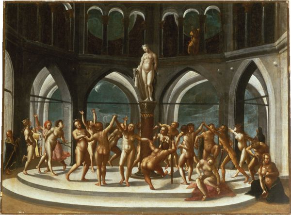 Curator: Well, hello there! This image practically hums with repressed anxieties, don’t you think? The stillness is so unnerving. Editor: Indeed. This painting is Paul Delvaux’s "City Worried," executed in 1941. It exemplifies Delvaux's unique brand of surrealism, emerging as it did from a Europe embroiled in anxiety and uncertainty, which, from the materials at play, we read from canvas and paint used amidst resource limitations brought on by WWII to even the act of artistic production becoming increasingly fraught, we find meaning imbued. Curator: Absolutely, the composition gives me a palpable sense of unease! The classical architecture looming behind that throng of nude figures seems indifferent to their…situation. What "situation," I can’t quite articulate! It's deliciously unsettling. Editor: The choice to juxtapose classical forms with undressed figures points to larger themes: the anxieties around the body politic during wartime, social precarity… also the complex production and performance of "femininity". The use of fresco techniques within easel painting practices also invites an important commentary about how the high arts become defamiliarized through material mixing and mingling across historical lines. Curator: Ah, the blending of epochs is masterful. And then you have that businessman standing stiffly amongst all these vulnerable bodies... It's as if reality itself has gone slightly off-kilter! A fever dream, if you will. Editor: Right, and note that his presence—the formal, suited man, among bare bodies—he highlights issues of social hierarchy, especially how war affected distinct segments of the workforce while also commenting on historical continuities. Even, I find, anxieties around labour practices under modernity and globalization. He serves as both intruder and marker of change... he points at issues that existed even then with a contemporary global marketplace increasingly interconnected while exploiting labor inequalities… The materials Delvaux utilized— the pigments, the priming of canvas, even down to brushwork— tell tales about those tensions implicit between traditional craft production being consumed and commodified within art markets itself! Curator: It all adds up to a feeling of displacement, a profound sense of being lost in translation… a world teetering on the brink. "City Worried" indeed! The palette amplifies this emotional tension as well -- that muted, dream-like, earthy tone with its touch of stark lighting seems strangely... nostalgic? Is that perverse to suggest? Editor: Perverse, no. Appropriate that through exploring materiality alongside representation, and considering modes of creation within broader economic trends allows a comprehensive insight into how Delvaux engaged in poignant and profound reflection.