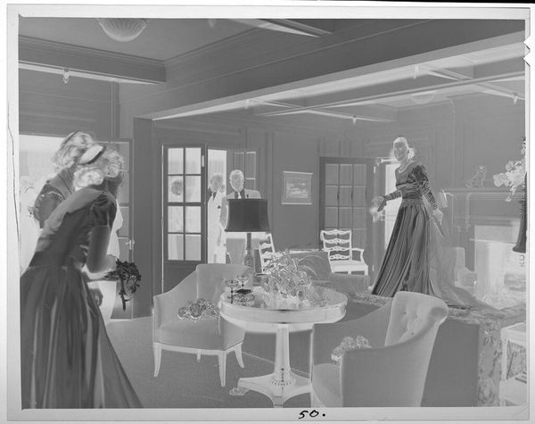 Curator: This is an intriguing, undated image by Martin Schweig, currently held at the Harvard Art Museums. It captures three young women in formal dresses within an opulent room. The mood is almost dreamlike. Editor: It looks like a reversed photograph, throwing off the light and shadows. The material of the dresses seems so heavy, like it could stand up on its own. What's the social context? Curator: Well, the dresses suggest a debutante ball or formal event. Schweig, whoever he was, likely moved within elite social circles to have gained such access, and this image functions as a record of that society. Editor: It’s more than just documentation. The dresses themselves signify status, consider the labor behind each stitch. Someone created them to be consumed and displayed, they are the physical manifestations of class. Curator: Absolutely, it's a performance of class. And photography itself became a tool for solidifying that performance, democratizing image-making while subtly reinforcing social hierarchies. Editor: I agree. The image makes me think about those involved in their creation - the tailors, seamstresses, and laborers whose work made such displays of wealth possible. Curator: Examining Schweig's work here, it seems he was aware of the complex social theater he was capturing, even if unintentionally. Editor: Indeed. It's a testament to how much an image can reveal, even when seemingly simple.