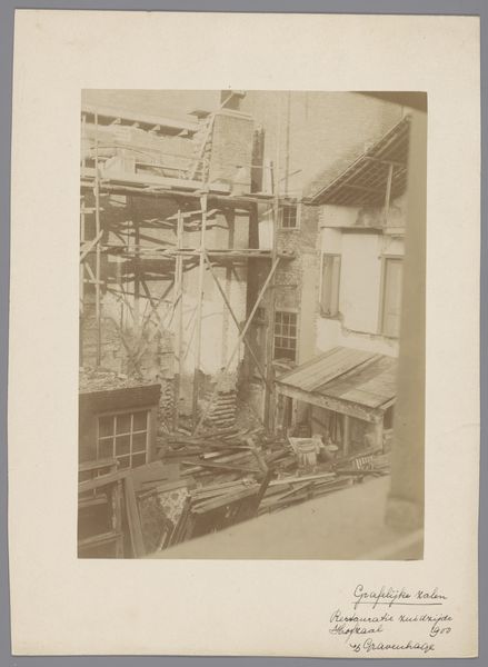 This photograph captures the interior of the Dutch Reformed Church in West-Graftdijk, likely taken around 1913. It was made with a camera, a relatively new technology at the time, but depicts a much older form of construction. Look at the raw, unfinished timbers reaching up to the ceiling; the ladder propped against them suggesting ongoing work. The image reveals the church's construction, alluding to the labor and craftsmanship involved in building and maintaining such a space. The photograph aesthetic is subdued, capturing the weight and texture of the wood and stone, the solid matter of the place of worship. This approach contrasts with the soaring, light-filled interiors we often associate with religious architecture. Instead, it highlights the physical effort required to erect and sustain this house of faith. It is an important reminder that behind every monument, there are countless hours of unseen labor, a tradition of craft, and a social context deeply embedded in the material reality of the building.