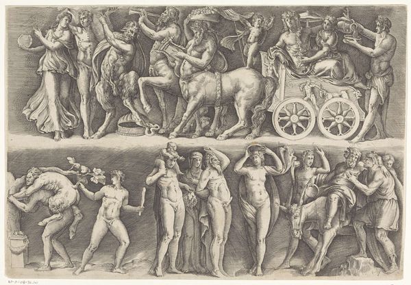 This print, dating from the 16th century, shows a reclining female figure on a chariot, drawn by two centaurs. It was made by an anonymous artist using the exacting technique of engraving, a process demanding immense skill and patience. The artist would have used a tool called a burin to carve lines into a copper plate. This painstaking work required absolute precision; each mark contributes to the final image, from the delicate shading of the figures to the bold lines defining their contours. The texture of the print, a result of the engraved lines, gives the artwork a tactile quality, inviting us to imagine the artist's hand at work. Engraving was not just a technical process; it was a means of reproducing images, making art accessible to a wider audience. The print medium itself democratizes image-making, contrasting with the unique, singular status of paintings or sculptures. So, when we look at this print, let’s appreciate the labor, the skill, and the social context that shaped its creation.