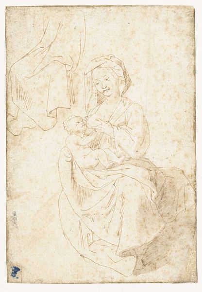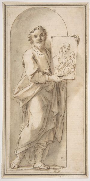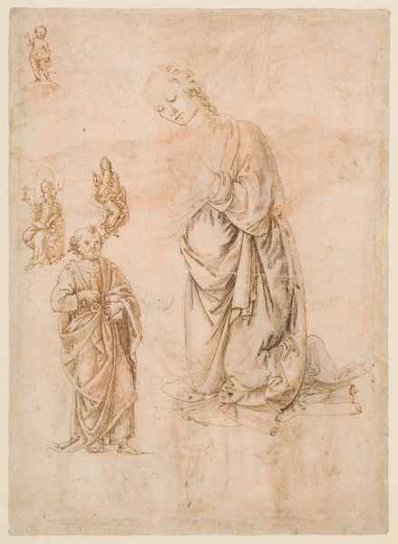 The right-hand section of the wall of the Stanza della Segnatura devoted to Justice features a depiction of the presentation of the decretals to Pope Gregory IX in the thirteenth century. The pen-and-ink drawing from the Städel Museum focusses primarily on the garments of the monks handing the legal codex to the pope. In the moment the drawing has been made, the composition had already been developed to its definitive form. The base of the papal throne is seen at the bottom; at the top the drawing ceases at a spot where, in the fresco, a figure is standing.