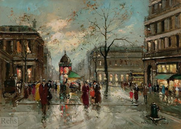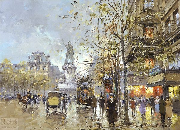 Édouard Cortès captured The Place de la République in Paris with oil on canvas. Cortès, known as the "Painter of Paris," renders the city not just as a visual spectacle, but as a stage for everyday life. Born in France to an artistic family, Cortès's work reflects a rapidly modernizing Paris. The Place de la République, a significant public square, embodies the spirit of French republicanism, acting as a common ground for Parisians of all social classes. Notice how Cortès blurs the figures, suggesting the anonymity of city life. The soft brushstrokes and warm color palette evoke a sense of nostalgia, while the reflections on the wet pavement add an element of dynamism. Cortès captures a moment in time. Cortès once said: "I paint what I see and I paint with love." He offers us not just an image of Paris, but an intimate experience of the city's atmosphere. This painting invites us to reflect on the relationship between urban spaces, identity, and memory.