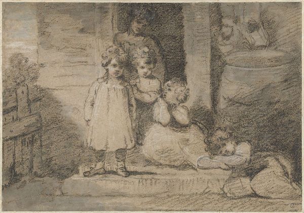Editor: Here we have a drawing titled "Handwerkende meisje en drie kinderen zittend op een bank met gekruiste armen," made sometime between 1865 and 1913 by Bramine Hubrecht. It’s a pencil and charcoal drawing. What strikes me is the somber mood; the children seem withdrawn. How do you interpret this work? Curator: There is a clear visual narrative here, steeped in symbolic weight. Notice how the seated children, arms crossed, almost mirror each other – a signifier of solidarity or perhaps shared weariness. Consider the lone figure of the girl working; her activity – likely mending or crafting – points towards themes of domestic responsibility and perhaps even economic hardship. Do you see a hint of resignation in her bowed head? Editor: I do, now that you mention it. And there's another face, barely sketched, in the background... what's the meaning? Curator: That spectral presence is fascinating. It could represent memory, perhaps a deceased parent or a sibling, whose absence permeates the scene. The drawing's muted palette adds to this sense of lingering sorrow, embedding layers of emotional depth within a seemingly simple genre scene. This isn’t merely a picture of children; it's a window into the complex emotional landscape of a family facing hardship. Can you see now how seemingly simple depictions carry generational memory? Editor: That’s incredible, I see so much more than I did at first. Thanks for helping me explore it! Curator: My pleasure. It’s a potent reminder that even seemingly mundane scenes are laden with meaning if you only know how to look for it.