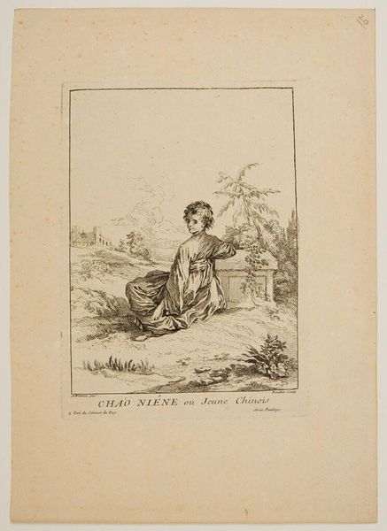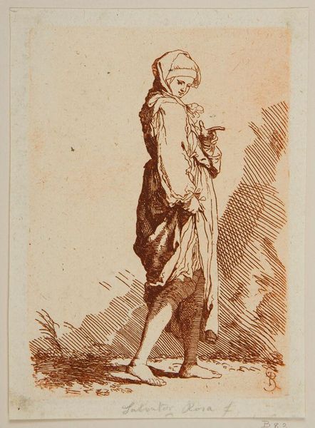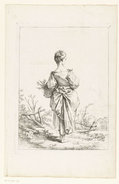 This is a delicate etching by J. van Strieland, depicting a woman standing in water, a basket in her arms. The method of etching itself is worth considering. An etching is made with acid, eating into the surface of a metal plate. The artist protects certain areas with a waxy ground, allowing the acid to bite into the exposed areas, creating lines and textures. This requires careful labor, precision, and control of the materials. The resulting print, with its fine lines and subtle shading, is evidence of the etcher's skill and craft. Notice how the process affects the final image. The lines are not bold or assertive, but rather delicate and nuanced. This softness gives the image a dreamlike quality, which in turn lends a certain dignity to the peasant subject. While the etching is small, the artist's labor and the qualities of the medium provide an intimate glimpse into a specific time and place. This artwork encourages us to consider the value of craft and the dignity of labor.