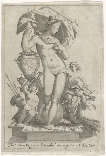 Editor: This is Jacob Matham's "Venus en Amor op de wolken," from between 1599 and 1603, a print housed in the Rijksmuseum. I am struck by the almost hyper-defined linework which gives a dramatic flair despite the absence of strong tonal contrast. How do you interpret the piece focusing on the relationship between form and meaning? Curator: Note how Matham utilizes the engraving technique, prioritizing line to delineate form. Observe the distinct lack of chiaroscuro; rather, value is achieved through density and direction of the lines. The subjects, Venus and Cupid, are constructed through complex systems of cross-hatching and parallel lines, emphasizing a concern for descriptive accuracy over emotional depth. Editor: So the formal constraints almost dictate a certain kind of emotional reading? The texture makes up for contrast in dark and light. Curator: Precisely. In the rendering of the cloudscape, for example, the formal strategy effectively evokes a sense of ethereal weightlessness through delicate linework. Consider how that effect would be changed if Matham relied instead on tonal modeling, through a medium such as charcoal. Also, note the oval form around the whole artwork; it provides structure but what does that form create when the space is largely filled with the figures and clouds? Editor: It does look less 'natural', so to speak. It puts even more emphasis on artifice and display. The artificial, curving line constrains the boundless heaven! I am starting to appreciate the degree to which his stylistic choices determine how we understand this baroque allegory. Curator: Agreed. Reflecting upon the artist’s deliberate orchestration of visual elements brings heightened clarity of his methods.