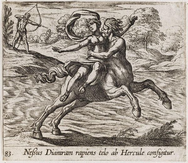 Editor: This is Antonio Tempesta's "Plate 83: Nessus Attempting to Take Dejanera from Hercules," an engraving from 1606. It’s incredibly dynamic, wouldn't you say? There's such clear tension between the figures. How do you interpret this work? Curator: Indeed. What strikes me is how Tempesta visualizes the power dynamics embedded within this mythological scene. Think about it: we have Nessus, a centaur, abducting Dejanera, while Hercules stands in the background, bow drawn. The image reflects not just a physical struggle but a power struggle deeply entrenched in issues of consent and male dominance, something incredibly relevant even today. Editor: So, you see the engraving as more than just a depiction of a mythological event? Curator: Absolutely. Nessus’s attempted abduction can be seen as a symbol of male aggression and entitlement. Dejanera, caught in the middle, embodies a certain vulnerability. The gaze she directs toward Hercules feels like a cry for justice. And Hercules, while poised to rescue her, represents the patriarchal system promising protection, but arriving late. Doesn't the whole scene expose a societal problem rather than celebrate a heroic resolution? Editor: That’s a really powerful interpretation. I hadn’t considered the deeper implications about the dynamics of power at play. It makes the scene even more disturbing, yet also more thought-provoking. Curator: Exactly! It encourages us to consider whose stories get told, and how. This isn’t just a historical image; it's a visual text that challenges us to confront uncomfortable truths about gender, power, and violence. Editor: Thank you. Now when I look at it, I will never see the artwork in the same light. Curator: Excellent! This shows us how Baroque art often served as a powerful tool to explore cultural beliefs and hidden tensions.
