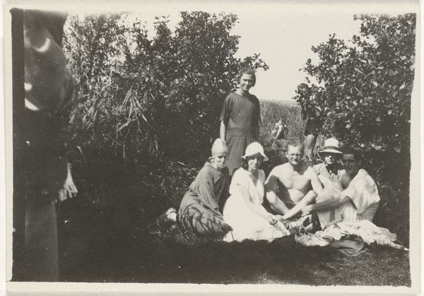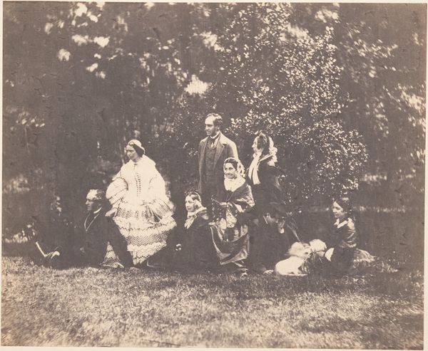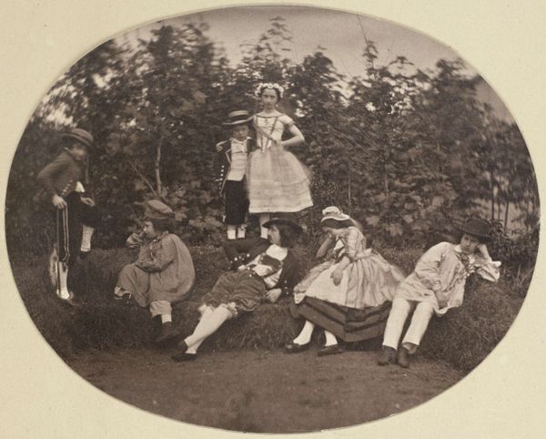 Curator: Welcome. Here we see an albumen print by Louis-Pierre-Théophile Dubois de Nehaut, tentatively titled *Women Stacking Carrots*, created sometime between 1854 and 1856. It resides here at the Metropolitan Museum. Editor: My first impression is, "Wow, that’s… round." Like peering through a very old, sepia-toned porthole into the past. There's something quite beautiful, and oddly eerie, about its symmetry. The women and that monumental stack of carrots...it’s so still and almost spectral. Curator: The photograph offers us an interesting window into 19th-century genre scenes. Group portraits like this one offer valuable insights into labor and community dynamics during this time. Photography was in its relative infancy, remember, so even "simple" scenes took meticulous planning and were highly posed. Editor: Right! That’s probably why everyone looks so... reserved. I mean, try holding a fake carrot stacking session for, what, five minutes, much less the time it probably took back then. The image presents them as archetypes almost – timeless women engaged in timeless work. You wonder what they’re really thinking! Curator: Precisely. Images like this contribute to broader discussions on labor history and the representation of working-class women in mid-19th century France. The arrangement of subjects – some at work, others seemingly supervising, offers us narrative layers. It provokes us to think of the societal dynamics that shaped not just the work, but even its photographic rendering. Editor: Yes, the arrangement… I keep coming back to that central carrot tower. It dominates the picture. It’s like some sort of surreal agricultural monument! It certainly speaks of communal effort but also seems… strangely ambitious. Is this reality or a staged fantasy? Curator: That is an excellent question and one that brings us back to the complicated politics inherent in early photographic practices. Even these seemingly quotidian scenes participated in crafting specific public narratives, both about the dignity of labor, but also about social order. Editor: This visit with Dubois de Nehaut really gets under my skin and sparks all these conflicting emotions: melancholy, awe, and slight bewilderment, even…I’m leaving this artwork pondering the story behind these ordinary folk, the making of this peculiar photograph, and the time lost and found within this sepia-toned oval. Curator: Indeed. Photography grants us proximity and a reflective distance. It’s why *Women Stacking Carrots* remains evocative to this day. Thank you for sharing your reflections.
