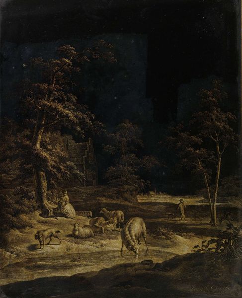 Editor: So this is “Landscape with Saint Bruno (?)”, an oil painting made sometime in the first half of the 18th century by Alessandro Magnasco. It’s incredibly moody – dark foreground, bright sky – but I’m also struck by how tactile the brushstrokes seem, especially in the trees. What draws your eye in this piece? Curator: What intrigues me most is the visible labour involved. Look closely at the rough canvas texture, the rapid, almost frantic brushwork. Magnasco isn’t trying to hide the process; he's flaunting it. Consider, then, who was commissioning and consuming these works. Editor: Patrons who valued… what, exactly? Virtuosity? The appearance of spontaneity? Curator: Precisely. Aristocrats consuming a vision of monastic life rendered with, frankly, upper-class ease and speed. Notice, also, the saint’s humble robes. Think of the actual labor that went into producing that cloth, contrasting it with the artist’s gesture and the patron's wealth used for purchase. Editor: So, the painting itself becomes a commentary on labor and class disparity, almost a…consumption of piety. The ‘genre painting’ aspect takes on new dimensions. Curator: Exactly! The painting functions on multiple material levels. It uses precious pigment applied rapidly to coarse canvas to create the _idea_ of simple, pious living. That contrast is what gives the piece its lasting power, its unsettling edge. The blurring of art and craft traditions is used to amplify such disparity. Editor: I see. It is not just about religious devotion. Thank you. I never considered how deeply class is embedded in artmaking itself! Curator: And conversely, how the means of art making itself becomes a subtle commentary of our relationship with material culture.