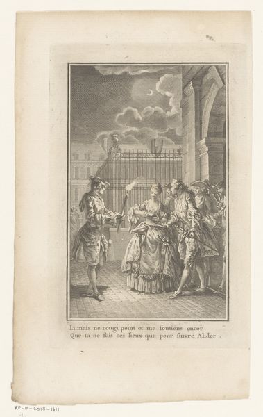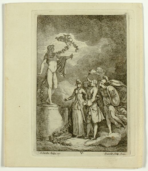This illustration was made by Georg Christian Schule around the turn of the 19th century. Notice how the figures are rigidly arranged within a carefully delineated space, typical of formal compositions of the period. The scene depicts a young couple, an oriental figure, and three kneeling Turkish soldiers. Linear precision defines each form, from the ornate details of the costumes to the architectural elements of the setting. The composition is organized to suggest power dynamics between the figures. The visual emphasis is on clarity and order. This is achieved through contrasting textures and tonal range to articulate form and space. Schule employs hatching and cross-hatching to model the figures and add depth. This highlights a clear and legible visual narrative. The artist uses formal techniques to reinforce the subject matter and underscore its themes of cultural interaction and power relations.