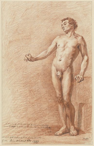 This Standing Male Nude was created by Benedetto Luti using red and black chalk on laid paper. The process of drawing with chalk involves a direct application of pigment to the surface, allowing for subtle gradations in tone. The laid paper provides a slightly textured surface, influencing the chalk's receptivity and creating a tactile quality. The chalk lends itself well to capturing the nuances of light and shadow on the figure's form. Luti likely employed sfumato, a technique of soft blending, to create a sense of volume and depth. This drawing, probably intended as a study, reflects the skilled traditions of academic draftsmanship. It’s a physically demanding undertaking, requiring both precision and a deep understanding of anatomy. By emphasizing the importance of materials and making, we can appreciate this drawing not just as a representation, but as a testament to the artist's labor, skill, and engagement with established artistic conventions.