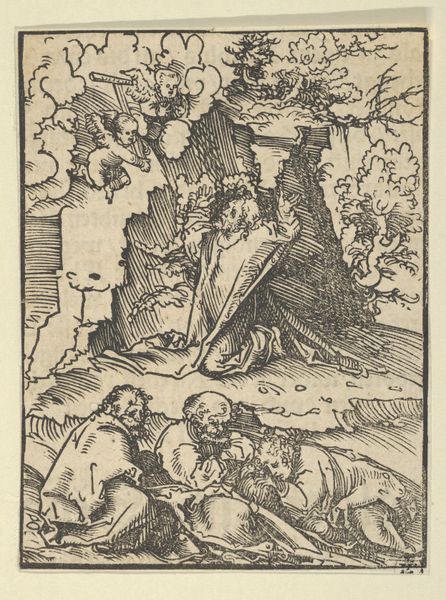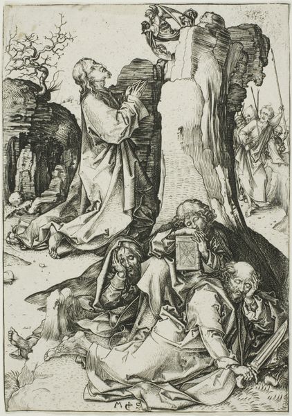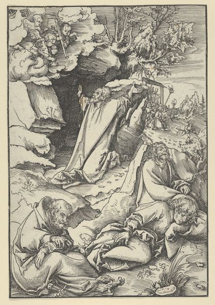 Editor: This engraving, "Christ Praying on the Mount of Olives, after Dürer," attributed to Marcantonio Raimondi, probably from the early 16th century, presents a densely detailed scene. It feels heavy, laden with impending doom. What resonates most strongly with you in this piece? Curator: The power of this image, even centuries later, stems from its complex visual encoding of memory and prophecy. Notice the angel appearing to Christ, bearing the cross – a powerful symbol not just of the coming crucifixion, but of sacrifice and redemption, visually linking Christ’s present agony with the future. It evokes the cultural memory of the Passion. Editor: So, the symbols are working on multiple levels. Is there something about the background, or setting, that would also trigger such powerful, long-lasting emotions? Curator: Precisely! The sleeping disciples and the approaching soldiers through the garden gate. Dürer and, by extension, Raimondi are reminding the viewer of betrayal and human fallibility. Look closely - how does the artist convey a sense of emotional weight through the rendering of the figures themselves? Editor: Well, Christ is kneeling, his hands clasped in prayer; he seems to be looking upwards as though pleading, and there's an agony etched on his face. The disciples are slumped over. It is like everyone knows something bad is about to happen. Curator: Exactly. And in a world of turmoil and uncertainty, these images of suffering and solace likely served as both warnings and affirmations. Raimondi wasn't just replicating Dürer; he was also ensuring the endurance and evolution of a vital visual vocabulary. What do you think viewers back then felt when they encountered it? Editor: I now feel I'm only just starting to understand what it meant to encounter such a picture. It would be a stark reminder of both faith and the ever-present potential for human failing. Curator: Indeed, the enduring power of symbols lies in their ability to continuously be re-interpreted and re-experienced.
