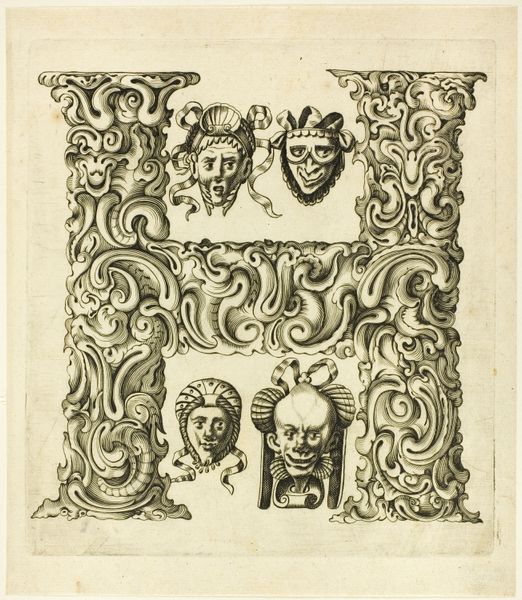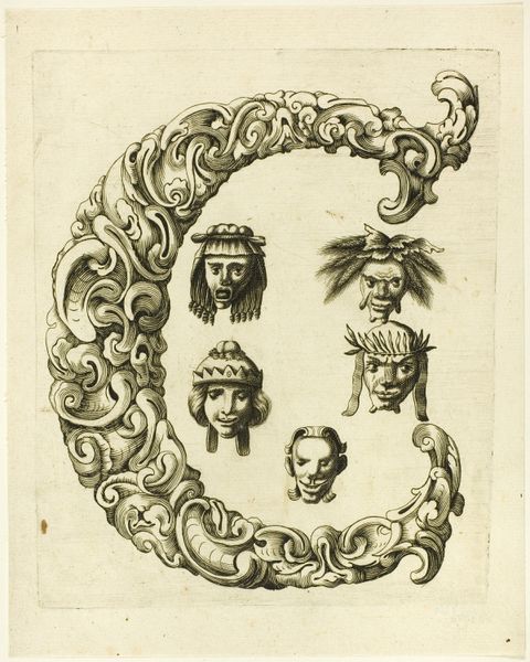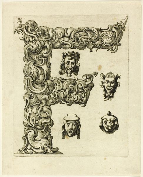 Curator: We're looking at "Letter R," a drawing, or rather an engraving, by Peter Aubry, dating back to 1630. Editor: My first thought is that this “R” is anything but simple. There’s an exuberant complexity to the form; it's visually dense and, dare I say, playfully grotesque. Curator: That assessment isn't far off! It's characteristic of the Baroque period's decorative arts in Germany. These ornamental letters, especially, are laden with symbolism. You have human faces interspersed with flora and fauna. Editor: The faces certainly catch the eye. Are they meant to represent something specific, or do they act as part of a broader symbolic language? I mean, each face has unique expression, from jovial to sinister. The medium itself seems to demand detailed execution. Curator: Precisely. Each of those faces alludes to classical and mythological figures; recall that faces, or masks, were used for theatrical drama or courtly performance. The letterform is not merely functional; it’s an exercise in cultural memory, recalling stories, historical associations that would resonate with audiences familiar with allegorical art. Editor: So, the viewer is meant to decode layers of meaning embedded within the curves and the carefully etched details? There’s definitely an interplay of positive and negative space. Notice the controlled lines and the texture! Curator: Absolutely. Each curve and face is positioned purposefully, prompting contemplation beyond the surface-level recognition of a letter. It is as if this artwork demands active participation from the audience to resurrect and engage in forgotten traditions. Editor: I see that tension between restraint and excess, typical for the Baroque. Its deliberate complexity makes it feel more imposing than merely decorative. This pushes against conventional interpretations. Curator: In many respects, yes. Through form, this seemingly straightforward ‘R’ opens doors to intricate cultural understanding. The use of traditional iconography in conjunction with the baroque structure helps us question visual literacy then and today. Editor: Well, now, when I look at it, it is a striking display that highlights the visual density during the period but prompts some compelling formal inquiries. Curator: Exactly! A dive into an ocean of visual encoding that transcends linguistic and historical divides.