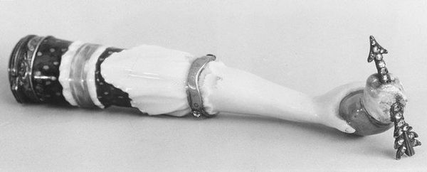 This cane handle, made from soft-paste porcelain, was crafted at the Saint-Cloud factory sometime between 1693 and 1766. Porcelain is a very particular material. Its capacity to take fine detail, combined with its pure white color, made it especially appealing for luxury objects. Note how the maker has exploited these qualities here, modeling the handle as the head of a fish, and adding delicate painted details. Fish were a popular motif in the 18th century, often symbolizing wealth and prosperity, reflecting the rising merchant classes of the period. Saint-Cloud was one of the first factories in France to successfully produce porcelain, which had previously been a closely guarded secret of Chinese manufacturers. The discovery of the formula and the industrial processes to make porcelain in Europe fueled a craze for the material. This handle, therefore, represents a fusion of material innovation, decorative refinement, and social aspiration. It shows how even a functional object like a cane could become a canvas for artistic expression, and also social aspiration.