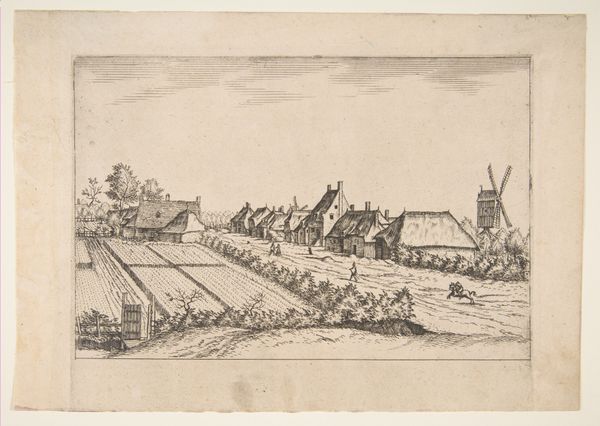 Curator: "Fields and a Road," a plate from "Regiunculae et Villae Aliquot Ducatus Brabantiae," was created between 1605 and 1615 by Claes Jansz. Visscher. The work, rendered as a print, offers a detailed look at a rural landscape, doesn’t it? Editor: It does indeed. I'm immediately struck by the sense of tranquility... or is it desolation? The tones are quite muted and the composition feels sparse. It almost feels like a memory, filtered through a heavy layer of nostalgia or something melancholic. Curator: I see it. Given the period, just after the Dutch Revolt and amidst significant social upheaval, the choice of such a seemingly calm subject becomes politically charged, perhaps hinting at the desire for simpler, pre-conflict times. Editor: Right, a pastoral longing! The figures, are they merely anecdotal, or do they symbolize the peasantry and their reliance on agriculture amidst sociopolitical tensions? It makes me think of the early stages of capitalism and the exploitation of rural labor. Curator: Perhaps. Visscher, who made his living primarily as a mapmaker and print publisher, presents the common countryside of Brabant. There's something quietly rebellious about celebrating these understated settings during the grand Baroque era, wouldn't you agree? Editor: Yes, like a deliberate choice to centre the lives of those typically on the margins. How might Visscher be highlighting the environmental impacts of conflict too? It’s difficult to tell at this scale, but maybe in its emphasis of simple routines, this landscape underscores an understated activism by simply focusing on daily survival and resilience. Curator: It could very well be. There is an unmistakable appreciation for the land and, therefore, an inherent value being ascribed to its inhabitants. I think Visscher successfully captures both the simplicity and complexity inherent to their existence through these stark images. Editor: So, the art whispers a silent scream about power and visibility, a reminder to acknowledge and act. These historical landscapes, as much as contemporary cityscapes, shape and reveal histories.