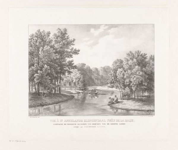 This print shows a scene from the pond at Het Loo Palace, created by an anonymous artist. It offers us a glimpse into the leisure activities of the elite, likely dating back to the time when the palace served as a royal residence. Notice how the composition subtly directs our gaze: a small boat filled with figures in the center of the pond, with a figure standing to the right, on the bank of the pond. Who are these people, and what stories do they carry? What does it mean to be served, and to be the server? The detailed rendering of the natural landscape, with its meticulously drawn trees and calm reflective water, invites us to consider the relationship between the people and their environment. It encourages us to reflect on who has access to nature, and how that access is represented. This artwork captures a moment in time, offering insight into the social dynamics and the complex issues that were likely part of everyday life.