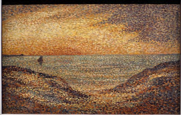 Editor: This is Childe Hassam’s "Sailing Vessel at Sea, Sunset," painted in 1904 with oil paints. It strikes me as less a representation of a sunset and more an exploration of color and light; the application feels quite abstract for an impressionist work. What do you see in this piece? Curator: Formally, I am most interested in the insistent horizontality that structures the work. Hassam's application of paint in layered, parallel strokes creates a very tangible surface. The subtle shifts in color within each register – oranges melting into yellows, blues bleeding into purples – establish depth without sacrificing the painting’s two-dimensionality. Do you find that the title limits your interpretation, or does it enhance your understanding? Editor: I think the title does provide context. Without it, I might interpret the dark strokes in the center as purely abstract, rather than recognizing a ship on the horizon. I’m intrigued by the interplay between the representational element of the vessel and the abstract rendering of the seascape. Curator: Precisely. Note how the composition directs our gaze to the convergence of line, form and hue. It emphasizes the act of painting itself. It beckons the viewer to engage with the properties of oil-paint in the most essential terms. We might even suggest the sailboat acts as a compositional device in this regard. Editor: So, it is the pure visuality that Hassam wants to present and for us to analyze? Curator: Absolutely. Stripped bare from much contextual information or narrative elements, we are left with its pure visual structure. And what do you think that yields in terms of interpreting the painting, its overall effect? Editor: It's liberating! Seeing the work primarily as a study of color and form encourages a more direct, less mediated engagement. Thank you. Curator: Indeed. Analyzing the painting based on its structural qualities really helps one to hone one's own close looking skills.