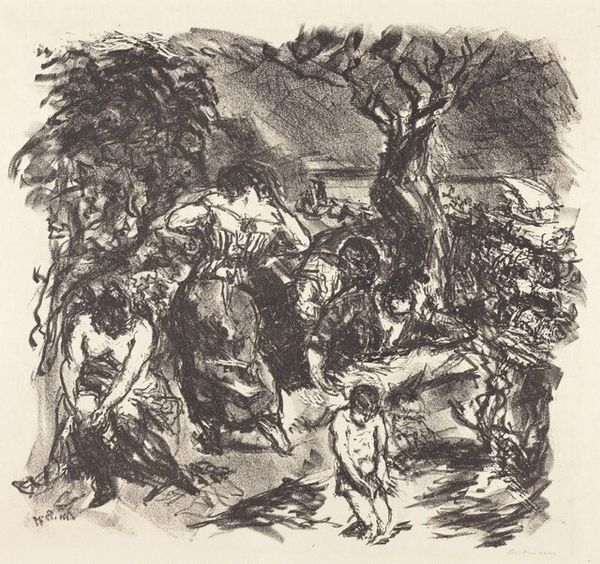 Curator: Let's turn our attention to this arresting intaglio print, "And I saw the heaven opened, and behold a white horse...XIX.11" by Bernard Reder. Editor: It feels biblical, definitely apocalyptic, almost aggressively surreal, don’t you think? The tonal contrast alone creates an undeniable sense of drama. Curator: Precisely. Reder draws directly from the Book of Revelation. Look closely—we see the rider on the white horse, a figure symbolizing divine judgment and victory. It's vital to view this piece as arising during the immense social upheavals of the 20th Century when many artists turned to the Bible to engage with the rise of totalitarian ideologies and their repercussions. Editor: The textural density here is phenomenal. Notice how Reder employs incredibly fine lines to build volume, shadow, creating almost a vibrating effect. Consider the composition – it is constructed around layers. Dark figures anchor the composition, providing a foil for the brightness of the central apparition. The artist uses an almost chaotic, dreamlike space to highlight a traditional religious subject, playing with the idea of formlessness against familiar images. Curator: Yes, the dense hatching, the grotesque figures, recall the horrors of war. While the biblical narrative offers hope, Reder presents a more complex picture, tinged with the anxieties of his time. His work resonates with broader conversations about the individual’s place during conflict and how institutional oppression influenced cultural life and individual choices in 1940s America. Editor: What stays with me is how such a relatively small print commands such attention through its expert control of tonal value. A brilliant exploitation of the intaglio technique to evoke complex psychological depth. It speaks to the strength that an image can take with minimal formal choices. Curator: Indeed. Considering Reder's personal history—his exile, his deep concern with freedom—this print acts as a powerful visual document about this turning point in his artmaking, embodying resilience and bearing witness during the war. Editor: The expressive mark-making, in combination with the religious content, delivers more feeling than first expected. This artwork moves me toward new trains of thought.