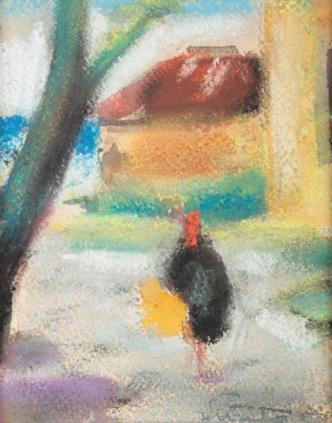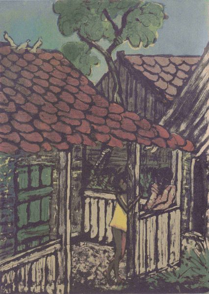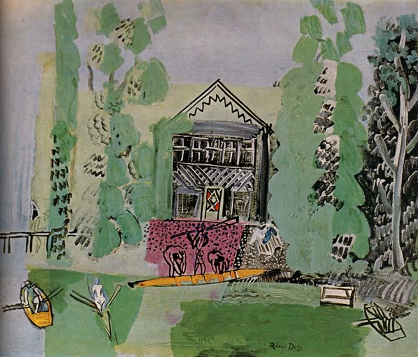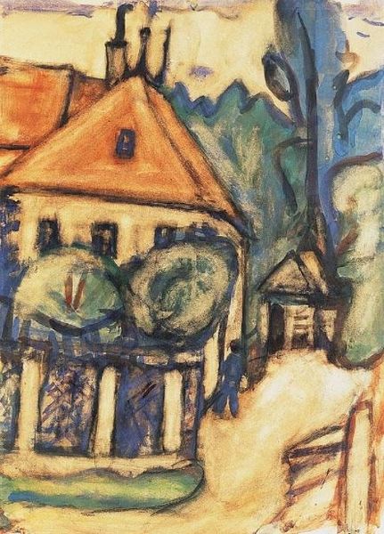 Curator: August Macke's watercolor, "House in the Garden," painted in 1914, presents us with a fascinating exploration of form and color within a domestic setting. Editor: Oh, I like it. It's wonderfully whimsical, isn't it? A touch…childlike almost? Like a memory of a garden, shimmering through the heat. Curator: Indeed. Note how Macke uses geometric forms to delineate the house and the surrounding foliage, yet the colors bleed and blend, softening the structural rigidity. Editor: Yes, and that slightly wonky perspective gives it a playful feel. It's not about perfect representation, but about capturing the *essence* of the place. Almost dreamlike. That roof—the colour sings! What kind of house do you reckon it is, beneath all those shapes? Curator: We might consider the semiotic function of the colors. The predominance of blues and greens—cool tones—establishes a sense of tranquility and harmony with nature. However, the bursts of red, punctuating the green, introduce a vibrant counterpoint. Editor: Right—little jolts of energy, eh? Keeps the eye moving. Those reds pop against the quieter blues in the house; and those soft yellows peek out, making me think of light filtering through the leaves on a sunny day... Curator: Exactly. Furthermore, the materiality of the watercolor itself is crucial. Its inherent fluidity allows for the subtle gradations of tone and the gentle merging of forms, characteristic of Expressionism. Editor: So, it's about letting the paint *do* its thing, almost like collaborating with the medium to evoke that fleeting moment, you know? Less control, more intuition. I wonder what was in his mind that afternoon? What colours surrounded him? Curator: One could read it as a synthesis of order and chaos, perhaps mirroring the artist's internal state during a period of rapid societal change preceding World War I. Editor: War…wow, yes! To think this lovely little house was painted on the cusp of such unimaginable destruction. Suddenly it feels more poignant; like a little safe haven tucked away from the madness. Curator: A pertinent interpretation. Ultimately, "House in the Garden" presents us with a multifaceted experience, revealing the dynamic interplay between structure and emotion. Editor: Exactly. The painting makes us linger on those details; makes us want to stay a little longer within its playful embrace, doesn’t it? Like visiting the childhood home you have never visited...