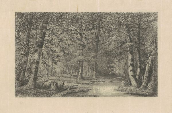 Editor: Here we have Carl Brenner's "On Laurel Creek," an etching from the 1870s or 80s. The oval composition and detailed linework create a tranquil scene. It feels so enclosed, intimate, almost like a secret glade. What symbols or stories do you see embedded in this image? Curator: The stillness of the water is compelling, wouldn’t you say? Consider water as a recurring motif across cultures – a symbol of purification, of the subconscious, of cyclical change. Look closely at the dead log in the water, an ambiguous omen for new growth in nature as well as within one’s self. What feelings does that juxtaposition evoke in you? Editor: It's definitely thought-provoking. I initially saw just a calm landscape, but now I'm picking up on a possible meditation on life cycles...maybe even loss. I didn't realize that that tiny detail could carry so much meaning. Is it common for landscapes to do that? Curator: Frequently. Landscapes invite us to project our own inner states onto the natural world. During the Romantic period, the artist's personal experience of the sublime became an overt theme. The landscape moved beyond mere representation. What echoes of Romanticism do you see here? Editor: The detail in the trees…their reaching branches... maybe suggests that seeking connection? Like there is this universal thing connecting all the elements in the scene. But is it also fair to see how that can mean they are intertwined to some decay? Curator: Exactly! The tangled branches and the starkness of the trees, while beautiful, speak of a hidden wildness, perhaps a reminder of mortality even amidst natural beauty. Considering that Laurel Creek may also reference laurel wreaths – the ultimate prize – the piece transforms into a quest. Do you interpret a sense of attainment, futility, or something else entirely? Editor: Wow, I'm really seeing so much more than just a pretty scene now! Thank you for pointing out all the interconnected symbols within the work, Curator. I can’t wait to keep pondering at what that quest may lead. Curator: The layers of visual information here point to just how deeply imagery, and nature as its own image, connects to our understanding of ourselves.