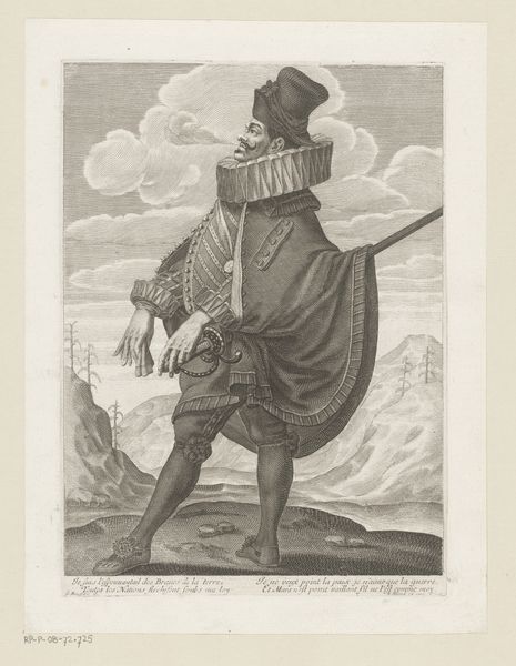 Editor: This is "Ruiter, a Gonaqua captain," a watercolor by Robert Jacob Gordon, dating to around 1778. There's something striking about his posture and the vast landscape behind him. What strikes you most when you look at this piece? Curator: Ah, Robert Jacob Gordon! This isn’t just a portrait, is it? It’s a little theatre of colonial encounter, isn't it? That vast landscape – that's the stage upon which identity, power, and perception play out. I find myself pondering: is this Ruiter's land, or is it Gordon's perception of it? Editor: That's interesting, because it does feel like the Captain is positioned almost like a specimen. Does the setting tell us something about how Gordon wanted to portray him? Curator: Absolutely. Gordon wasn't just painting a man; he was curating an image of the “other.” Notice the detail in Ruiter's clothing, contrasted with the almost sketched-in landscape. It’s as if Ruiter is being cataloged, categorized. What do *you* make of the light? How it hits him versus the background? Editor: It makes him almost pop from the background. Like he's superimposed rather than integrated. I hadn't really thought about it that way before. Curator: Precisely. The sharp focus separates him, turns him into an exhibit. Colonial art, particularly, becomes a powerful tool not only to represent but also to shape perceptions. Editor: So, more than just a portrait, it's a statement about a whole era and its values. Curator: Indeed! It whispers of power, observation, and the complicated dance of cultures meeting on uncertain ground. It reminds me of a passage: "The eye sees only what the mind is prepared to comprehend." How true, no?
