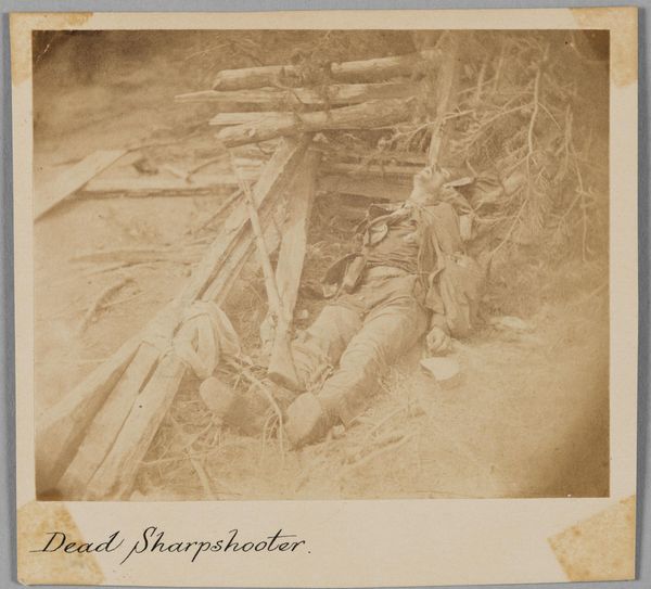 Editor: This is Timothy O'Sullivan's photograph, "Sharpshooter." It's a haunting image, showing what seems to be a fallen soldier on a desolate field. What statements do you think O'Sullivan was trying to make? Curator: It's crucial to recognize the photograph's context. During the Civil War, photography began shaping public opinion on a larger scale. O'Sullivan's work goes beyond documenting a battle; it forces us to confront the brutal realities of war and the devastating impact on individual bodies. This image asks us to question the narratives we create around war. Editor: So, it's less about glorifying conflict and more about showing its human cost? Curator: Precisely. O'Sullivan's lens challenges us to see beyond the battlefield and to acknowledge the individual stories of loss and sacrifice often overshadowed by grand narratives of war. Editor: I didn't consider it that way at first. It's a powerful reminder of the importance of historical context. Curator: Indeed. Art is rarely created in a vacuum. Considering the historical and cultural forces at play allows us to engage with it on a much deeper level.