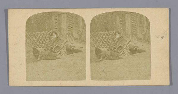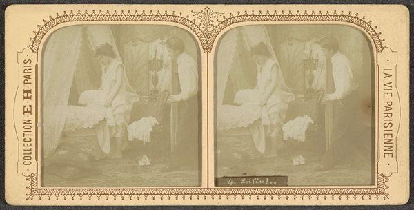 Editor: Here we have an interesting stereo photograph titled "Vrouw maakt toilet," placing it somewhere between 1880 and 1905, artist unknown. The pale image depicts a woman, likely in a domestic setting, performing her toilette. The twin images give it this strange 3D effect... What strikes me most is the deliberate construction of the scene; what do you see in this piece? Curator: I'm intrigued by how the anonymity, coupled with the intimate setting, impacts the symbolism here. The "toilette" transcends mere hygiene; it’s a ritual, laden with cultural significance. Note how photography, still relatively new, intersects with genre painting—everyday life elevated, examined. Editor: Genre painting in a photograph? That's an interesting collision of artistic intentions... So, the act of getting ready becomes something more significant? Curator: Precisely! Consider the mirrored effect, the repetition... it speaks to both societal expectations of women and the internal performance of identity. Clothing and grooming are visual signsifiers of the domestic space, signaling status and respectability. Is she conforming or resisting? That question hangs in the air. How does this pose resonate with you, given today’s understanding of identity? Editor: That makes me reconsider my initial observation about its construction. It's like she's both on display and in her own private world... I never thought a seemingly simple image could contain such layered ideas. Curator: The beauty of art lies in its echoes through time. Images, like this one, carry cultural memories; understanding those symbols unlocks a deeper appreciation. Editor: Absolutely. I am off to re-evaluate my own bathroom routine! Thanks for sharing your insights.