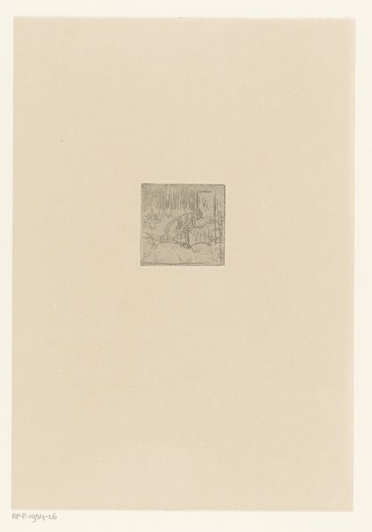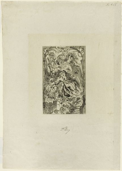 Editor: This is Hermine David's "Saint Bernadette," an etching. It's a small, delicate work; what strikes me is the stark contrast between the figure and the dark, almost chaotic, surrounding elements. What can you tell me about it? Curator: The etching process itself is crucial here. Consider the labor involved, the acid's bite into the metal plate, and the multiple prints that could be made. This image of Saint Bernadette becomes a commodity, distributed and consumed within a specific religious and social context. How does that change your understanding of the work? Editor: I guess it moves it away from pure religious devotion and towards something more... accessible? Less rarefied? Thanks, that really clarified it.