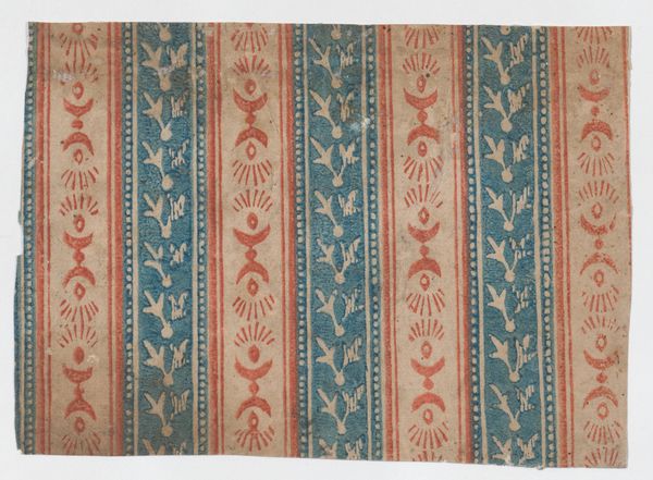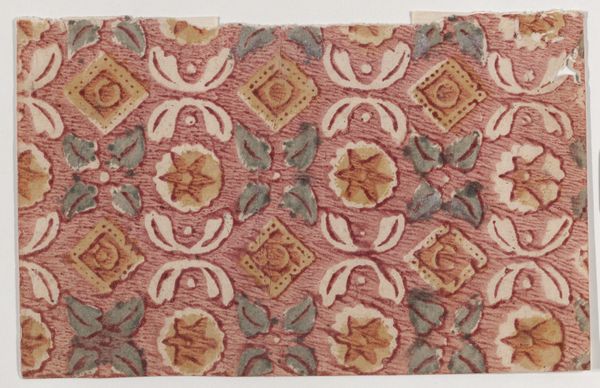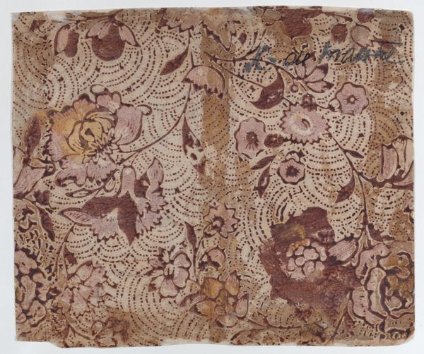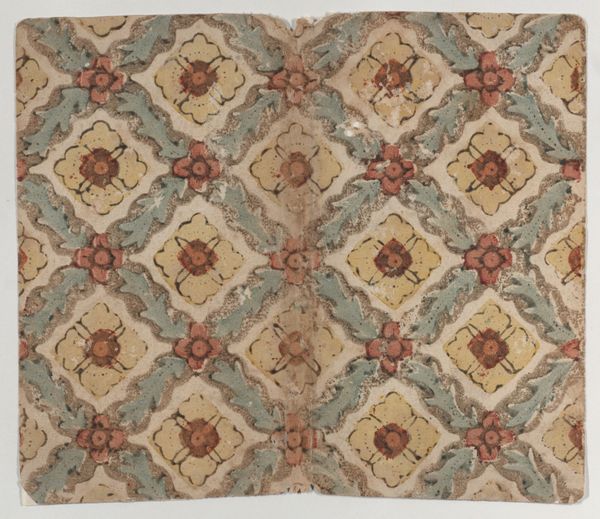 Editor: This work is called "Sheet with overall leaf pattern" and it's by an anonymous artist, dating back to somewhere between 1775 and 1875. It’s currently housed at the Metropolitan Museum of Art. The repetitive design has a slightly autumnal feel, like leaves changing color. What's your take on this textile drawing? Curator: It whispers of a world obsessed with bringing nature indoors. Can you imagine a parlour decked out in this print? It is so characteristic of the Arts and Crafts movement. To me, it evokes the tension between man's impulse to control nature through design, and the wild, untamed beauty that resists such control. What do you make of the use of negative space – those little dots scattered between the leaves? Editor: I see what you mean. The dots add to the patterned effect, maybe a bit like scattered seeds, but yes, they definitely create more structure and feel planned. It makes me think about the industrial revolution, and a desire to push against mechanisation, finding pleasure in handcrafted art. Curator: Exactly! A tiny rebellion in every repeat. And in choosing such a natural, simple form – the leaf – the artist seems to be saying, "beauty isn't about complexity, it's about finding the extraordinary in the ordinary". Is it successful, do you think, as textile design? Editor: Definitely! It's very comforting, calming, and I can easily picture it as curtains or upholstery in a cozy space. I hadn’t thought about it as a quiet protest, which is something I’ll take away from this conversation. Curator: And I appreciate you highlighting its potential for comfort – design as refuge. Perhaps that's the greatest act of rebellion of all.